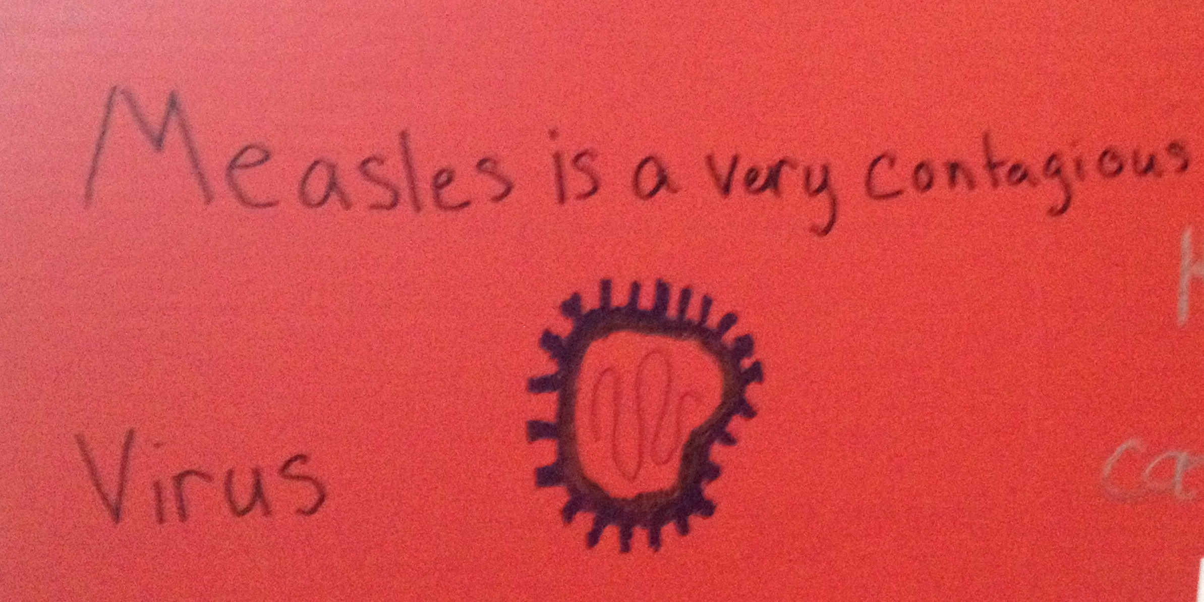 The two children were given a power point presentation on measles created by a board certified infectious diseases physician and selected the information that they felt was relevant. Information about measles on the poster included the annual number of measles cases, measles-related hospitalizations, and measles-related deaths pre-vaccine (Image 1), and information about the contagious nature of the virus as well as an artistic rendering of the virus (Figure 2).
