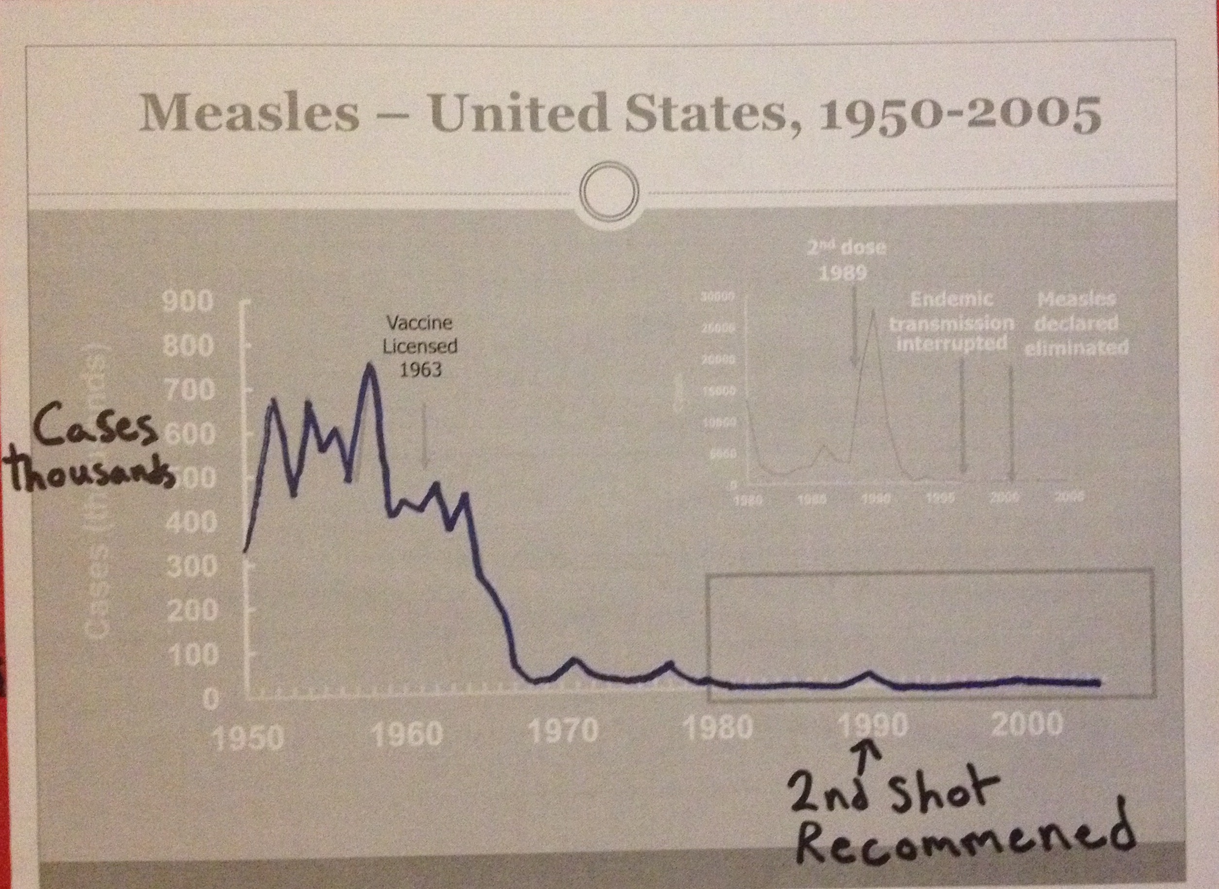 Information about the MMR included the impact of vaccination, specifically reducing the risk of acquiring measles if exposed from 90% to 1-3%, a graph of the impact of vaccination on the number of cases of measles annually in the United States (Figure 3), information on vaccine safety, and the fact that the measles vaccine has never contained mercury (the parent advisor suggested the mercury information although the children questioned this as they had no idea why they should mention something that had never been in the vaccine in the first place).
