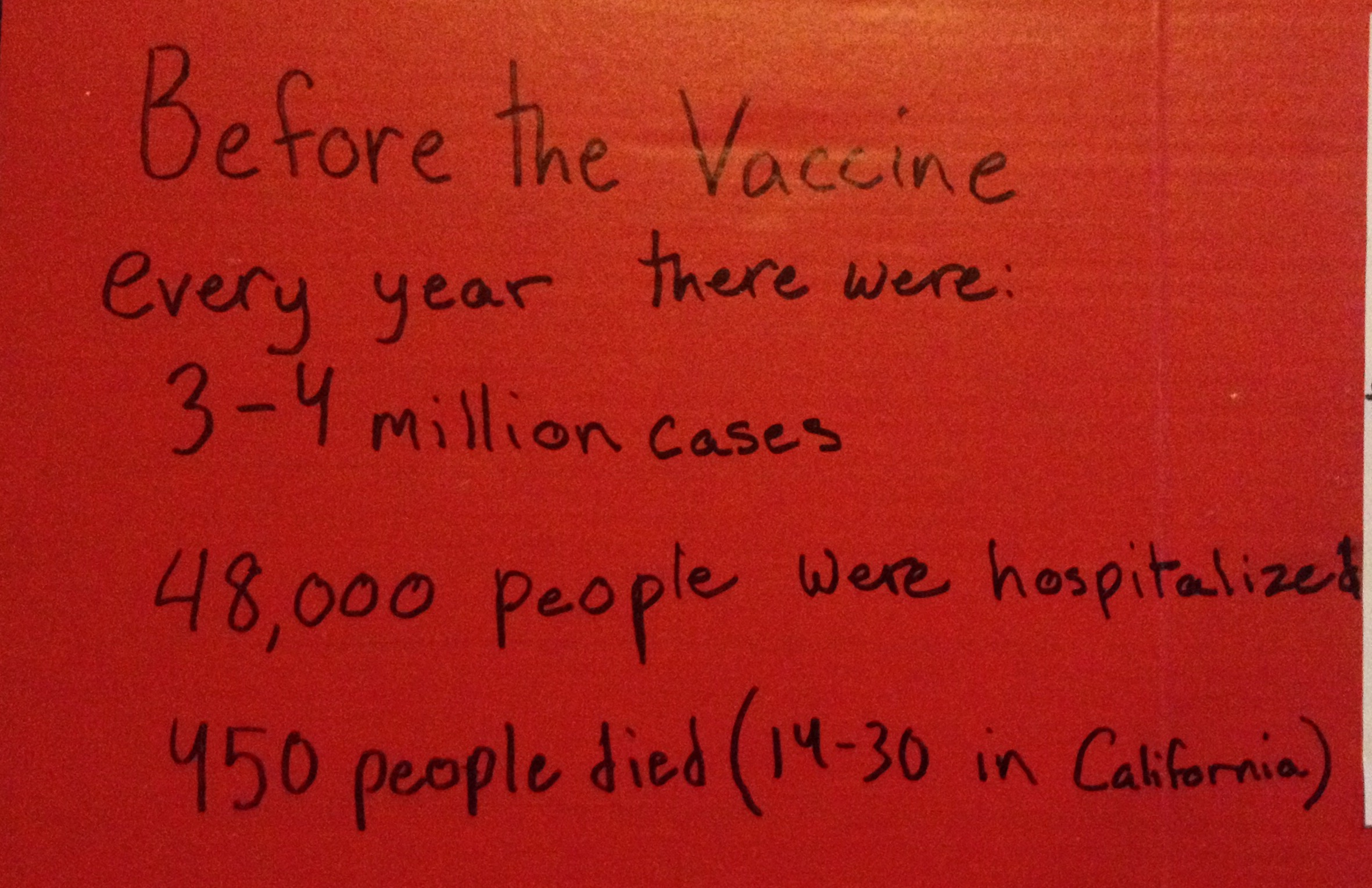 Methods: Two fifth grade students were given educational material about the measles and the MMR vaccine and set about creating a poster containing information they thought would be helpful. The poster board was a standard Office Depot tri-fold display board with a red background (the color was chosen by the students).