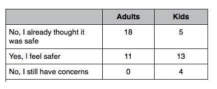 Discussion: The 13 children who voted that they felt safer after reading the poster all were accompanied by a parent who read through the poster with them suggesting that parents can do a lot to help their children understand vaccine safety. The four children who voted that they still had concerns appeared more focused on the idea of a shot than any long-term consequences, either negative or positive. It appeared as if some of the eleven adults who voted that they felt safer may have been trying to reward the young scientists for their efforts rather than a true change in beliefs and so more research may be needed to understand whether numbers for this sub-group represent a true impact on knowledge or bias. The lack of responses from adults in the category “No, I still have concerns” was a curious finding leading the investigators to wonder if parents who oppose vaccination based on non-scientific beliefs are simply not the kind who attend science fairs. Alternate theories for the lack of voting in this category include peer pressure, that parents who oppose vaccination might not be open to information and thus simply passed the poster board by in favor of the volcano exhibit two posters down, or felt uncomfortable expressing their views in public as coincidentally the very morning of the science fair the school district e-mailed a letter indicating all unvaccinated children will be out of school for 21 days if there is a case of measles at the school.