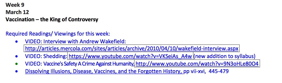 The syllabus from week 9 (where the anti-vaccine pseudoscience takes center stage):