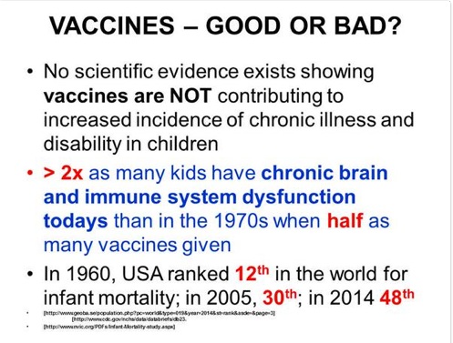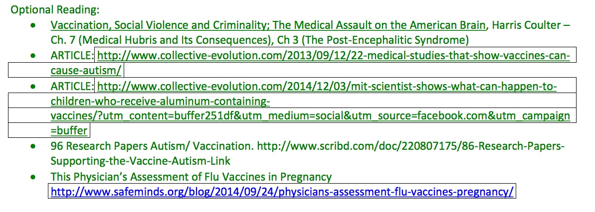 The material covered in the course was an egregious example of anti vaccine mumbo jumbo and truly a sad example of ignoring the scientific method. All the reading material was included in the lectures and consisted of anti-vaccine tropes (scientific papers apparently too old school for Torcolacci). There is an excellent storify from Isabelle Duchaine including many of the Powerpoint slides from the class. Here are a couple of doozies: