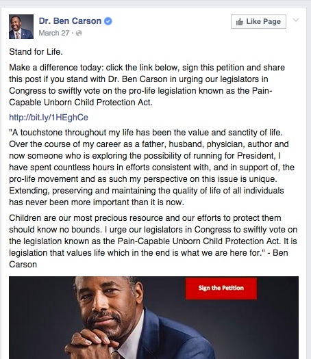 Dr. Ben Carson, neurosurgeon and GOP hopeful, recently asked his supporters on Facebook to sign a petition to urge congress to pass H.R. 36 The Pain-Capable Child Protection Act.