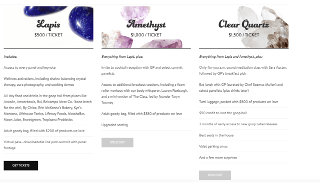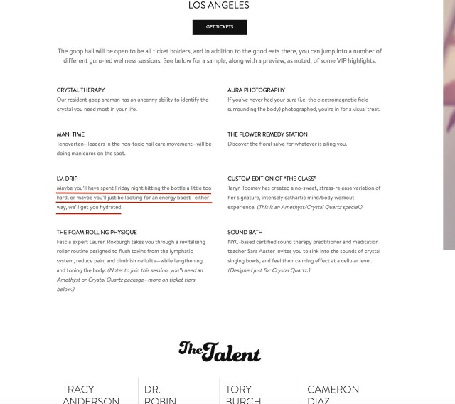 The woman who is so afraid of fake toxins is actually promoting a real one and an inflammatory one at that. Alcohol is also carcinogenic and harms the liver, but Paltrow and GOOP either don’t know or don’t care. Not only is binge-drinking recovery a featured event at her swellness event (God knows what supposed anti inflammatory swill might be in the intravenous) there’s a cocktail party with Gwyneth if you pay enough (and so many have shelled out the cash that those levels have sold out). Don’t get me wrong, I like a cocktail or glass of wine, but I’m not shilling fear of toxins for cash or promoting drinking to the point of serious intoxication. The irony and the gall of frightening women about non-existent toxins lurking in tampons or bras while not just promoting alcohol but toxic amounts of alcohol is maddening and disgusting. But that is GOOP’s brand of medicine, fuck science because it gets in the way of cash.
