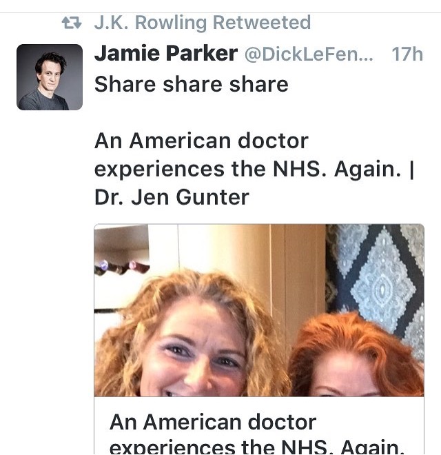 Last year I was in England and had another interaction with the NHS. This time taking my cousin Helen to Sunderland Royal Hospital with a broken ankle. Once again the NHS showed us lots of love so I wrote about it. That post garnered even more attention than the first. It was even re tweeted by J.K. Rowling. The greater reach of this second post was partly attributable to my growing profile as a blogger, the fact that I had now accrued a base who supported the NHS thanks to the first post that I wrote, and of course people in the U.K. do like periodic reminders from outsiders about how good things are relative to other health systems. It is nice to be told that your grass is actually greener.