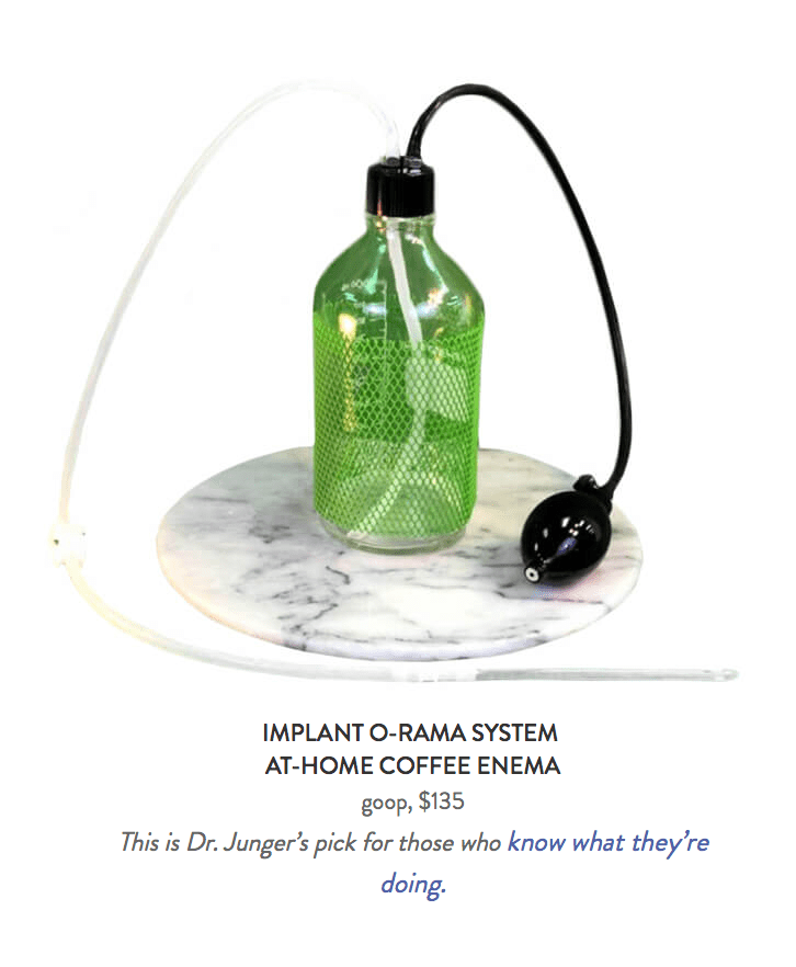 I know the people at goop will either ignore the inquiries from reporters or release a statement saying the article is “a conversation” not a promotion and that they included the advice of a board-certified doctor, Dr. Alejandro Junger  but anytime you lend someone else your platform their ideas are now your ideas. That is why I never let anyone write guest posts for my blog. And let’s be real, if you are selling the hardware to shoot coffee up your ass then you are promoting it as a therapy especially as goop actually called the $135 coffee-enema making machine “Dr. Junger’s pick.” I mean come on.